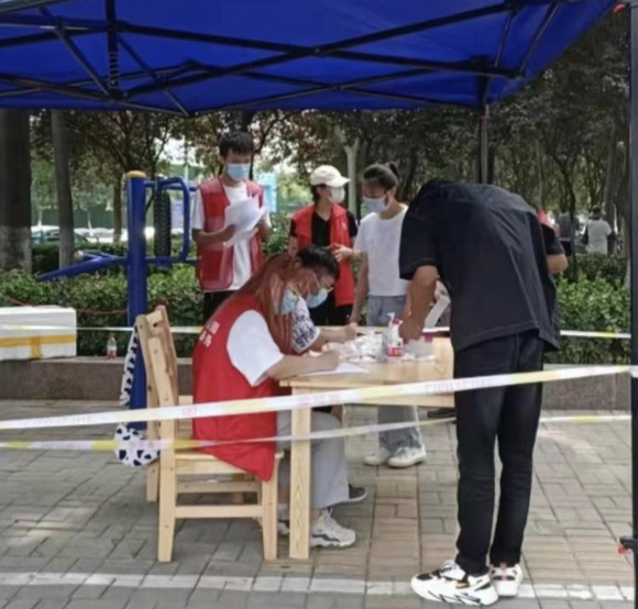 20级注会1班成森在修武县核酸检测点,协助医护人员维护排队秩序,完成信息登记等工作。