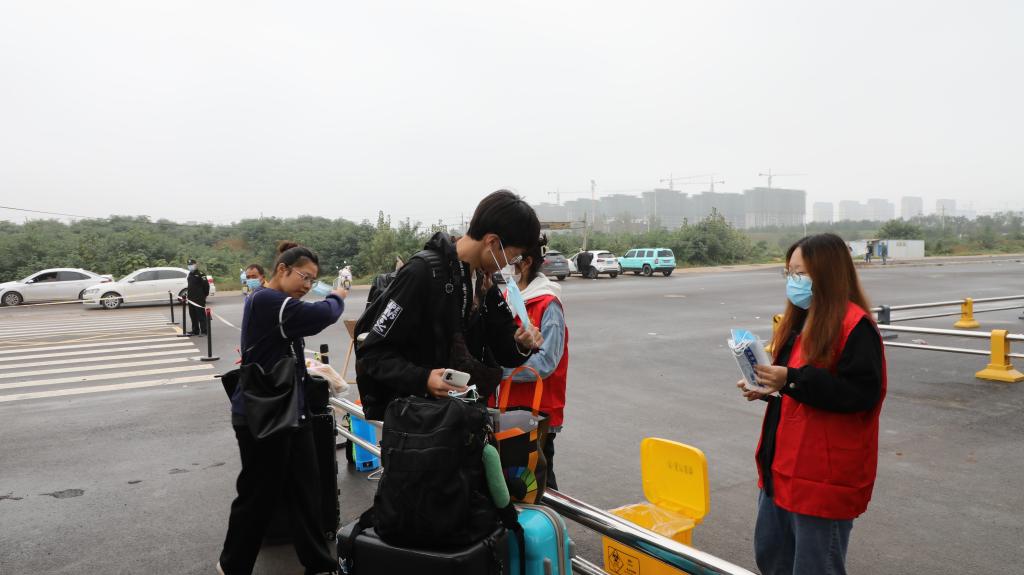 在校门口,学校设置学生返校专用通道,各系组织辅导员、志愿者参与学生返校报到审核工作,各报道点井然有序。在志愿者的引导下,返校学生依次查验身份信息、健康码和行程码,提交48小时核酸检测阴性证明、个人健康承诺书、个人14日健康登记表,并在行李消杀、口罩更换、体温检测后入校。