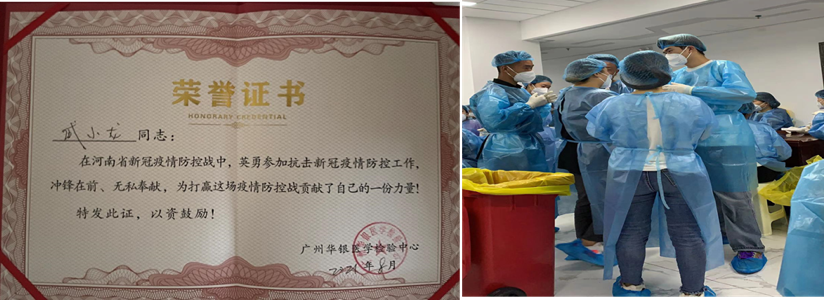 8月6日-20日,武小龙在郑州市广州华银医学体验中心担任核酸检测志愿者,主要负责接收核酸检测样本,对样本进行统计归类,上传样本检测信息。因为人手欠缺,他经常工作到深夜,却从不说累。他说:“很荣幸自己能为养育我多年的城市尽一份力,虽然个人的力量微不足道,但是河南人民在灾难面前众志成城、同舟共济的精神始终激励着我。”