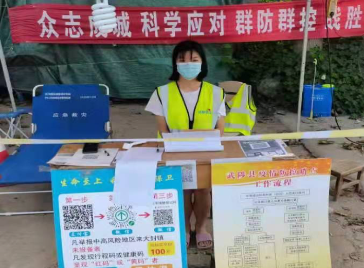 8月13日-20日,葛玲玲在汝南县板店乡玉皇庙村担任疫情防控志愿者,主要负责在疫情防控卡点值班,对外来车辆和人员进行信息登记、测量体温和查询行程码,对固定路段进行喷洒消杀。她说:“作为返乡大学生,我应当自觉承担防疫义务,为家乡的疫情防控贡献一份自己的力量。”