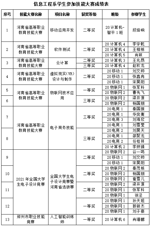 近日,ylzzcom永利总站线路检测信息工程系学生在2021年河南省高等职业教育技能大赛、全国大学生电子设计竞赛河南赛区比赛、2021年郑州市职业技能竞赛等8个赛项中发挥出色,频频获奖,其中在2021年河南省高等职业教育技能大赛中荣获物联网技术应用赛项团体一等奖。