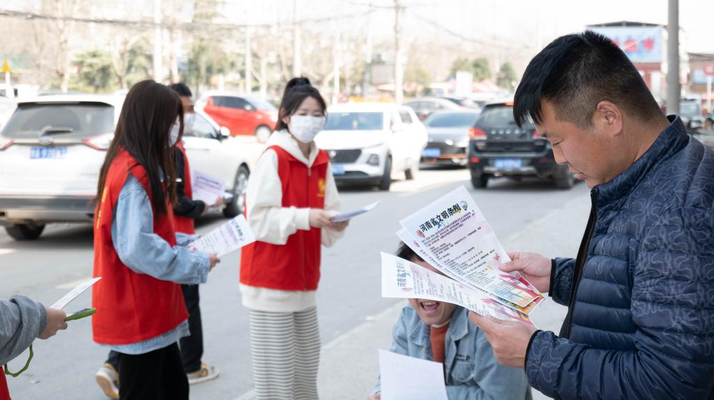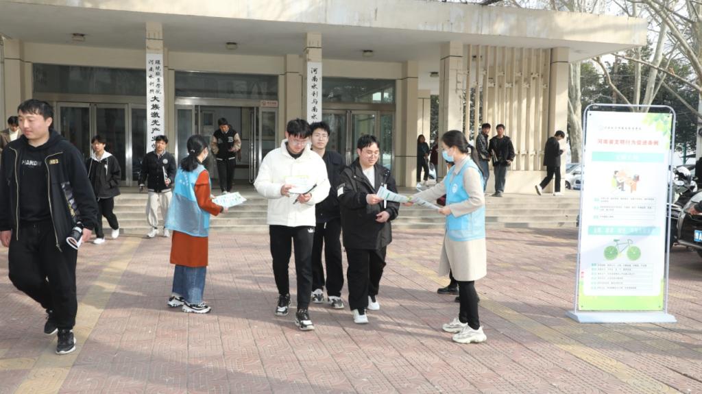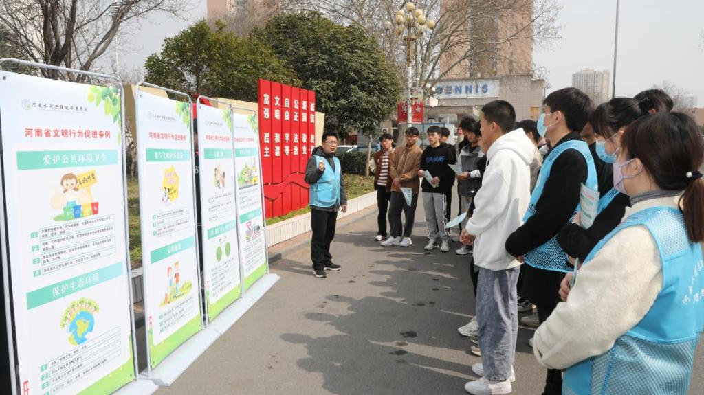 党群党总支党员在校园主干道摆放《河南省文明行为促进条例》宣传展幅,向青年学生宣讲《河南省文明行为促进条例》具体内容,深入校园操场、宿舍楼、教学楼等场所,发放《河南省文明行为促进条例》宣传页,并通过校内电子屏播放宣传标语,营造了浓厚的学习氛围。