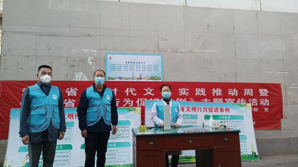 在学校家属区,行政党总支党员通过讲解《河南省文明行为促进条例》展板,引导群众养成文明习惯,树立文明风尚。