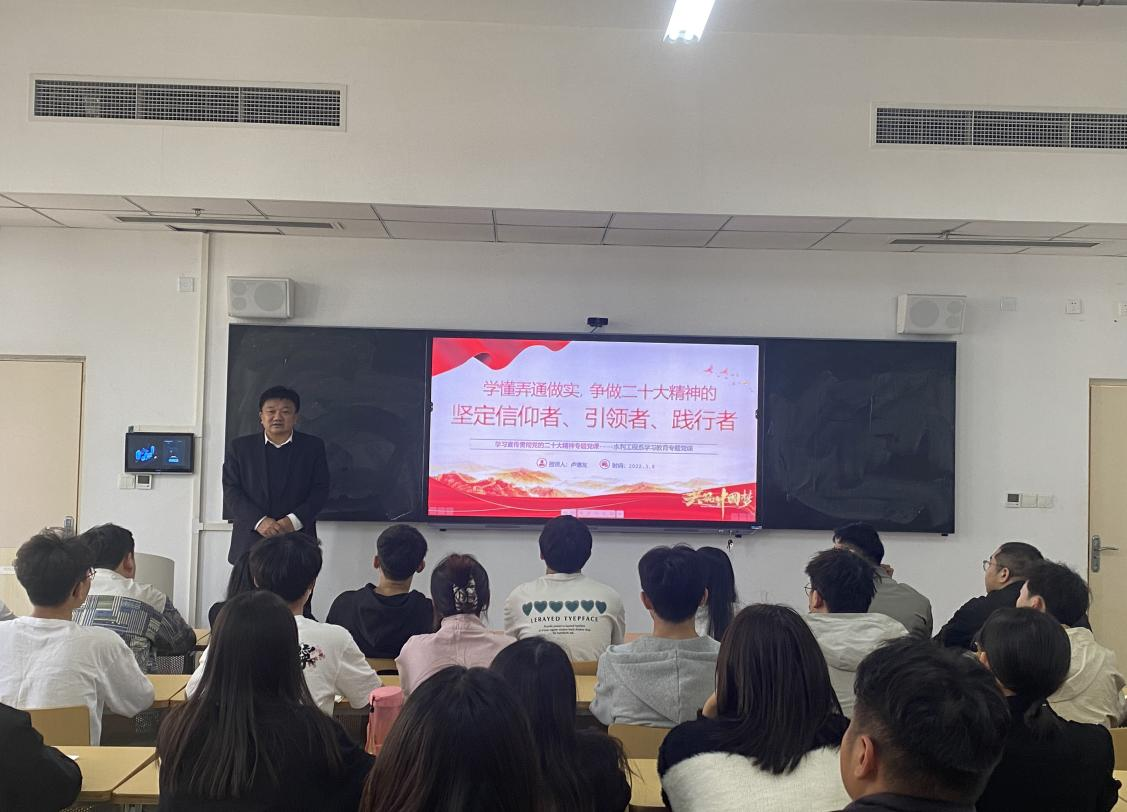 3月8日,水利工程系开展“学懂弄通做实,争做二十大精神的坚定信仰者、引领者、践行者”主题党课,系党总支书记卢德友主讲,入党积极分子参加。