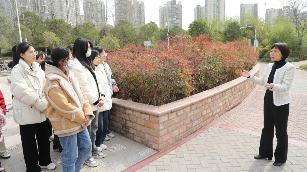揭牌仪式结束后,大家一同参观了文化公园,了解了公园的建设理念、园林布局和蕴含的文化内涵。郑州市插花花艺市级技能大师工作室领办人、绿文管理中心正高级工程师李文玲结合园内的植物品种及其特点,为同学们上了一堂别开生面的专业实践教学课,受到了大家的喜爱。