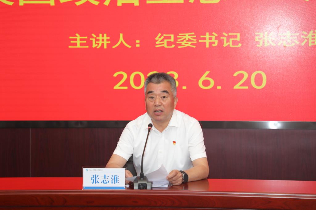 会上,校纪委书记张志淮以《增强纪律意识,积极营造风清气正的校园政治生态》为题,围绕充分认识新时代党中央对党的纪律建设作出的部署和要求、违反“六大纪律”方面的行为表现、做遵守纪律规矩的模范等三个方面,为全体参会人员讲授纪法专题党课。校纪委副书记、纪检监察处处长刘国发通报了今年发生在教育系统的三起典型案例,并利用端午节重要时间节点,面对面同中层领导干部集体进行廉政谈话和廉洁过节提醒。全体参会人员集中观看了《法治与责任》警示教育专题片。