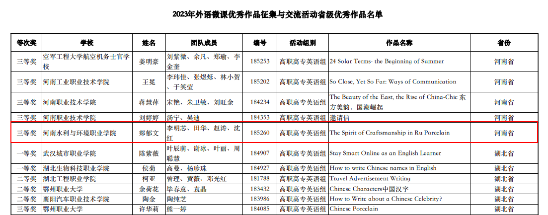 近日,“2023年外语微课优秀作品征集与交流活动”省级优秀作品获奖名单公布,ylzzcom永利总站线路检测基础教学部教师郏郁文、李明芯、田华、赵涛、沈红的微课作品《The Spirit of Craftsmanship in Ru Porcelain》,获高职高专英语组省级优秀作品三等奖。