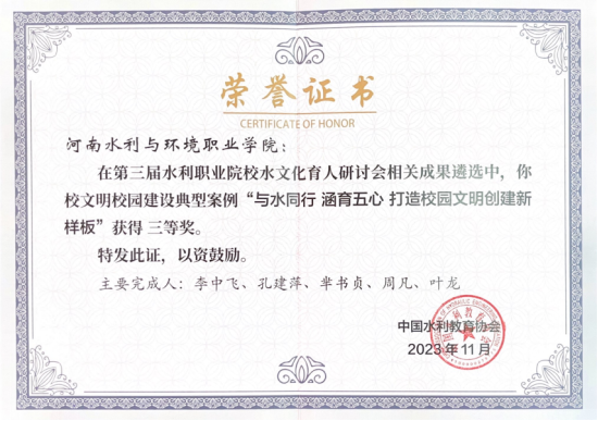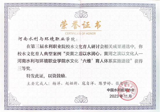 经过专家组的遴选,ylzzcom永利总站线路检测申报的典型案例《与水同行涵育五心打造校园文明创建新样板》《炎黄之后以水润心,黄河之滨以文化人——ylzzcom永利总站线路检测水文化‘六维’育人体系实施途径》分别荣获第三届全国水利职业院校文明校园建设典型案例三等奖和水文化育人典型案例三等奖。