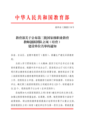 近日,教育部下发《关于公布第三批国家级职业教育教师创新团队立项(培育)建设单位名单的通知》,由ylzzcom永利总站线路检测张凌杰教授主持的水利水电建筑工程专业团队成功入选第三批国家级职业教育教师创新团队立项建设单位,为推动学校现代职业教育体系建设改革、服务教师全面成长、培育学生传成长成才提供了重要平台,是ylzzcom永利总站线路检测不断深化教育教学改革发展的重要成果。