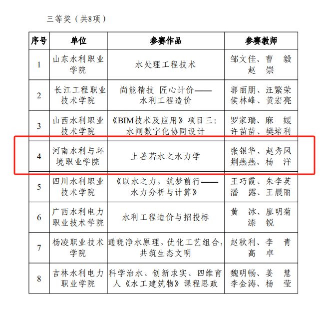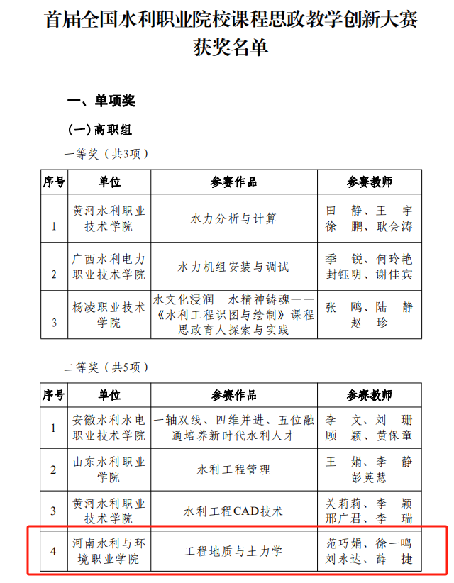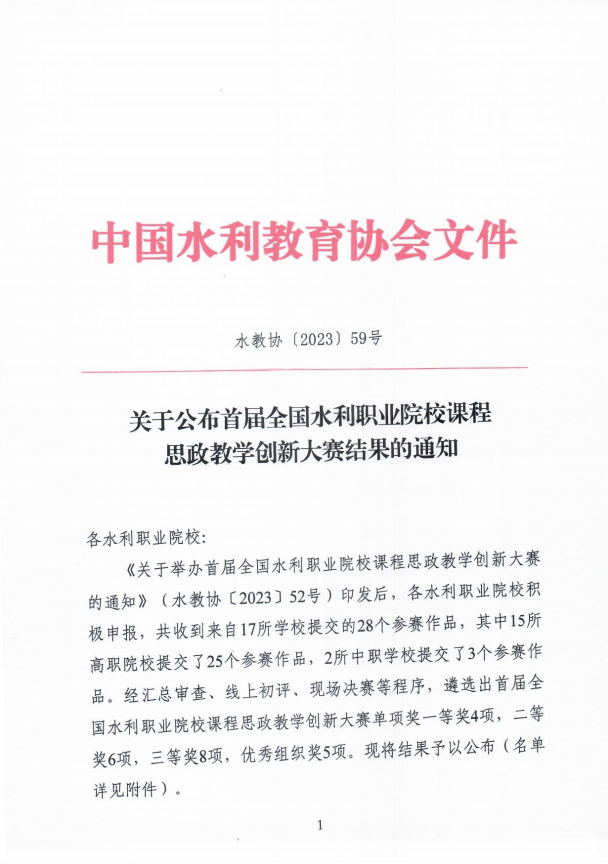 12月29日,中国水利教育协会下发《关于公布首届全国水利职业院校课程思政教学创新大赛结果的通知》水教协〔2023〕59号,ylzzcom永利总站线路检测参赛作品《工程地质与土力学》和《上善若水之水力学》分别获得高职组二等奖、三等奖,学校荣获优秀组织奖。