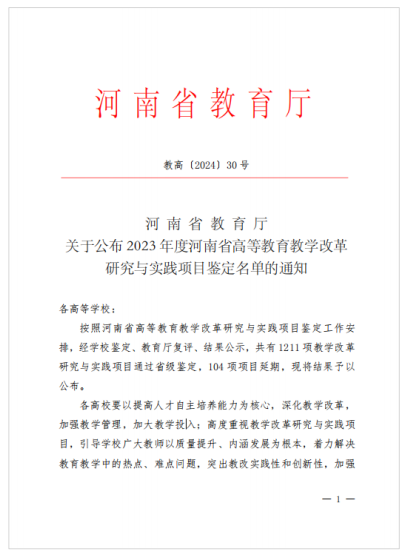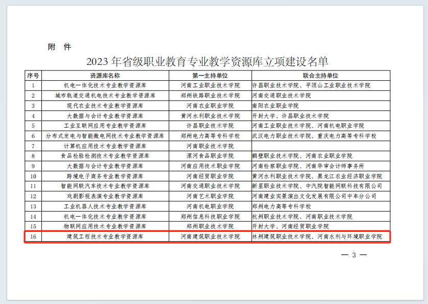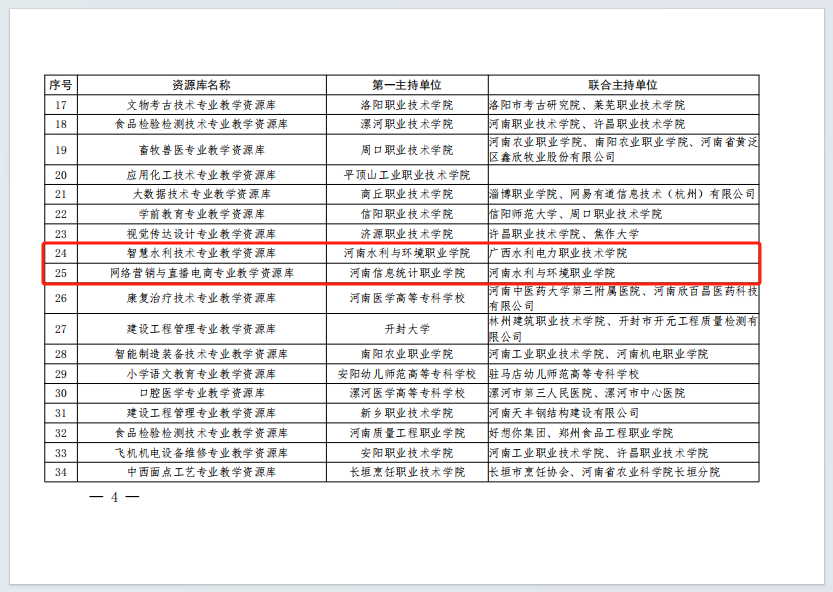 近日,河南省教育厅下发了《河南省教育厅办公室关于公布2023年河南省职业教育专业教学资源库立项建设名单的通知》(教办职成〔2024〕17号),ylzzcom永利总站线路检测主持的智慧水利技术专业教学资源库和联合主持的建筑工程技术、网络营销与直播电商专业教学资源库3个项目获批立项建设项目。目前,ylzzcom永利总站线路检测共7个(其中4个为主持单位)专业教学资源库获得省级立项建设。