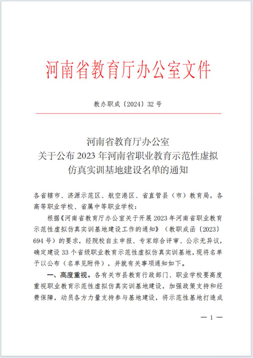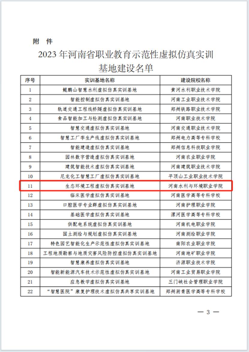 近日,河南省教育厅公布《河南省教育厅办公室关于公布2023年河南省职业教育示范性虚拟仿真实训基地建设名单的通知》(教办职成〔2024〕32号),ylzzcom永利总站线路检测申报的“生态环境工程虚拟仿真实训基地”项目成功入选。