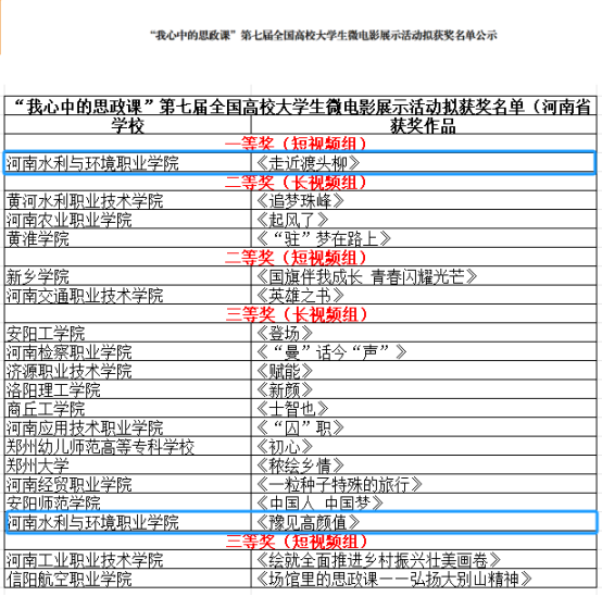 本次活动共评选出特等奖作品17项、一等奖作品50项、二等奖作品99项、三等奖作品166项;单项奖7项。其中,河南高校斩获一等奖1项,二等奖5项,三等奖13项。ylzzcom永利总站线路检测推荐的作品《走近渡头柳》是河南省唯一一个一等奖的获奖作品,ylzzcom永利总站线路检测是唯一一个获得2个奖项的高职院校,这是ylzzcom永利总站线路检测在思政课建设上取得的重大突破。