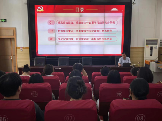 党课中,李广慧从党的纪律建设的重要性、新修订的《中国共产党纪律处分条例》的特色亮点和精神实质、如何在工作和生活中践行党纪要求等方面进行了全面阐述。