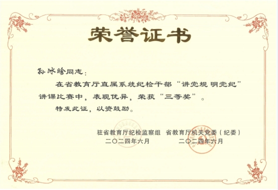 近日,由河南省纪委监委驻省教育厅纪检监察组举办的“讲党规、明党纪”讲课比赛成功举办,ylzzcom永利总站线路检测纪检监察处孙冰晗老师在比赛中表现优异,荣获三等奖。