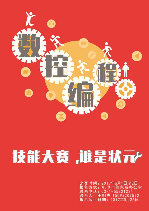 数控编程技能大赛方案 一、大赛目的 通过举办数控编程技能大赛,不仅丰富了学生的校园生活,也给学生提供了一个展示能力的平台,创建了一个良好的学习氛围。同时为参加省级技能大赛选拔人才。 二、大赛主题 推进学风建设,培养高技术人才 三、大赛内容 竞赛内容 数控编程比赛分两个项目:一个是数控车(60分),一个是数控铣(40分) 单个竞赛项目总时间均为3小时,分为第一阶段“数控编程及仿真加工(1.5小时)”和第二阶段“进行实体零件加工并提交产品”(1.5小时),分别为50%和50%的权重 四、参赛对象 学院全体学生均可报名参赛。 五、参赛时间、地点 2017年6月1日至2日,数控仿真在综合楼五楼,数控加工在综合楼一楼。 六、报名方式 报名联系方式:机电与信息工程系系办: 联系电话:0371-65821221 联系人 :王明杰 15093209572 报名截止日期:2017年6月26日。 七、奖项设置 自主创意组和技能竞赛组各设一等奖一名,二等奖两名,三等奖三名,颁发荣誉证书,并有精美奖品。获奖学生作品会通过学院网络进行宣传展示,表现优秀学生将获得推荐参加相关省级技能竞赛项目机会。
