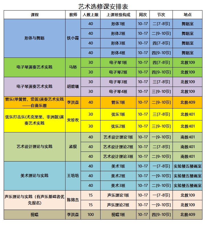 1.本次艺术选修课有:形体与舞蹈、电子琴演奏艺术实践、管乐(竖笛)演奏艺术实践(需自备竖笛)、视唱、弦乐打击乐(尤克里里、非洲鼓)、艺术设计理论与实践、美术理论与实践,声乐理论与实践(有声乐基础者优先报名),共八门课程;