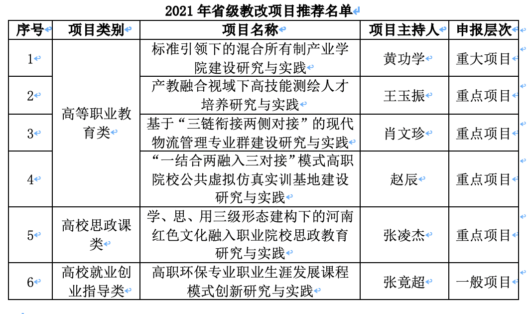 根据《河南省教育厅办公室关于做好2021年河南省高等教育教学改革研究与实践项目立项工作的通知》(教办高〔2021〕376号)文件精神,ylzzcom永利总站线路检测省级教改项目申报限额6个(包含4个高等职业教育类项目、1个高校思政课类项目和1个高校就业创业指导类项目)。经个人申报、部门初审,思想政治理论教学部申报高校思政课类项目1个,创新创业学院申报高校就业创业指导类项目1个,其他部门共申报高等职业教育类项目12个。经过专家组评审,拟向省教育厅推荐《标准引领下的混合所有制产业学院建设研究与实践》等4个高等职业教育类项目和2个专项项目。现将推荐名单予以公示,公示期为5个工作日(2022年1月14日至1月20日),公示期内如有异议,请以书面、电话方式向科研外事处、纪检监察处反映或面谈。