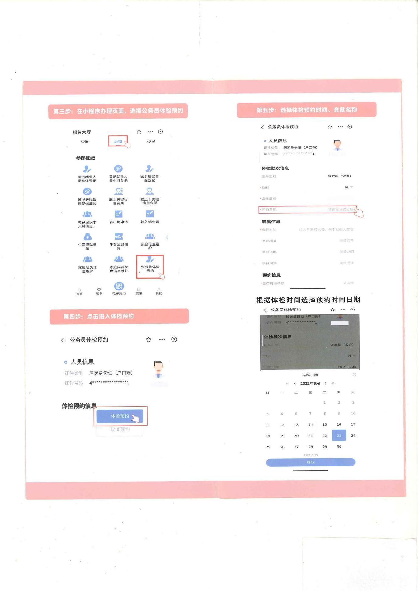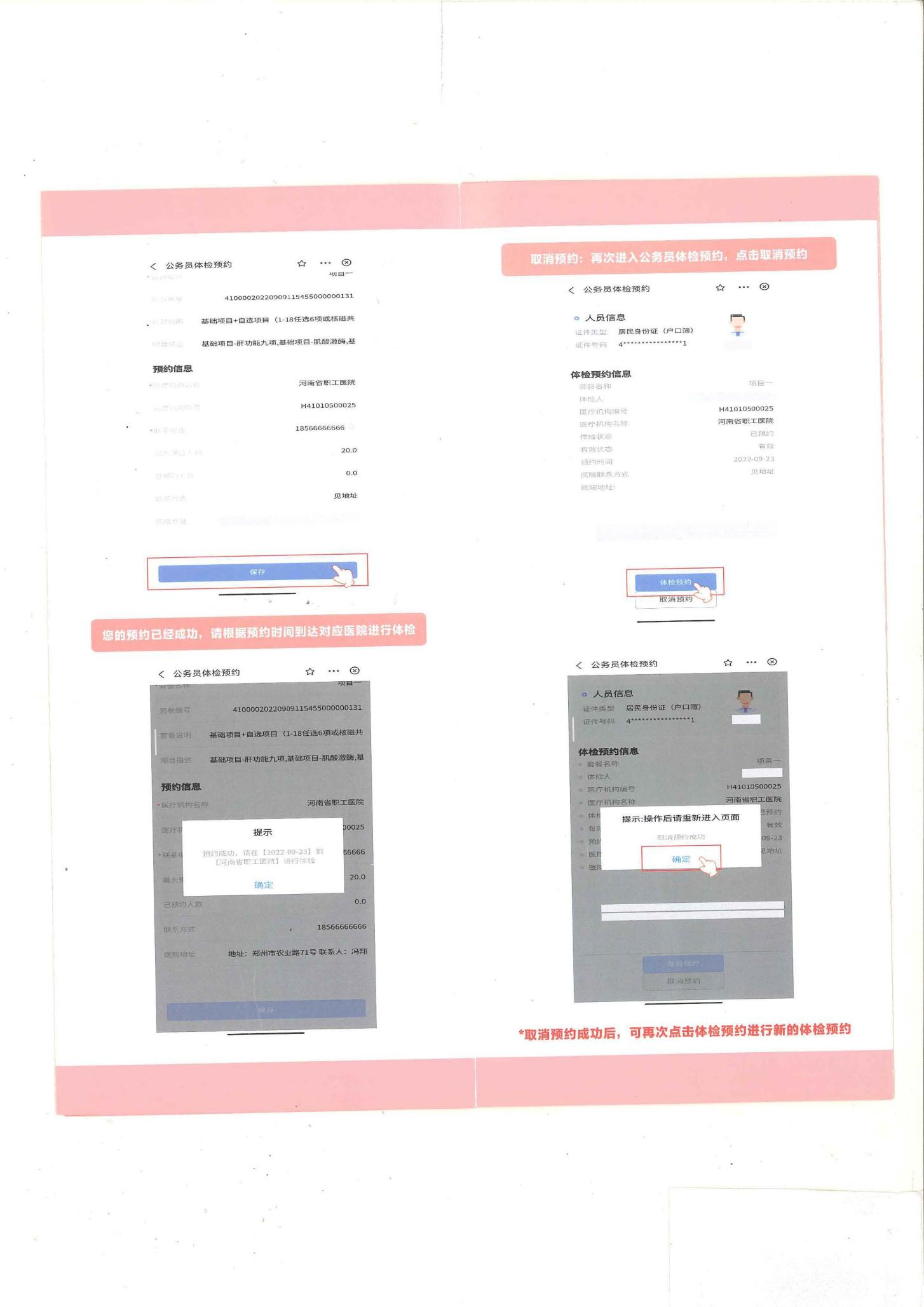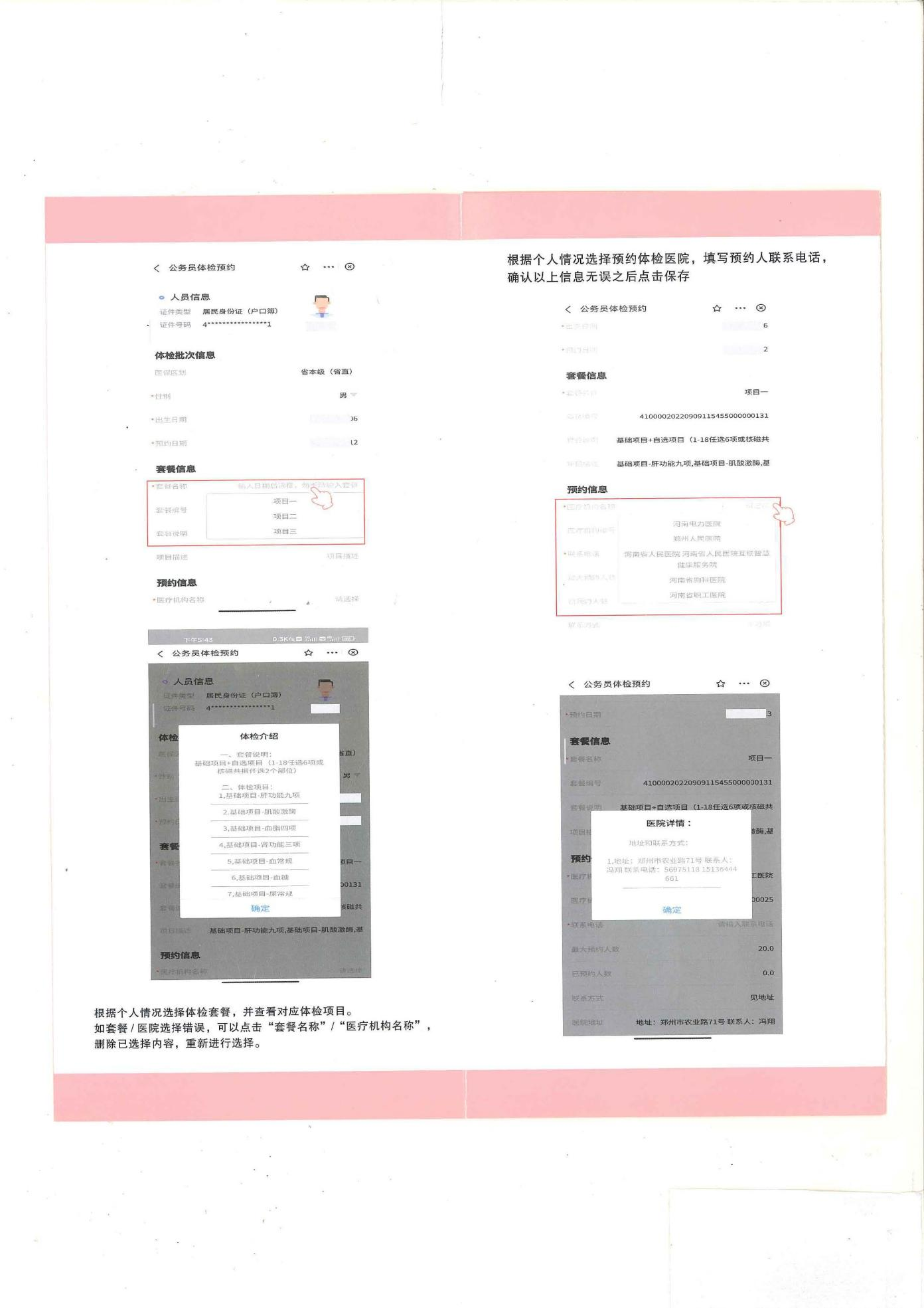 (一)预约体检。参检人员可通过“河南省医疗保障服务中心” 微信小程序/“河南医保”支付宝小程序进行体检预约、选定医院、选择项目等(未去体检前可以自行撤销后再次预约),也可直接前往定点体检医院进行线下预约体检。定点体检医院可根据预约推送情况合理安排体检人数。异地安置人员可选择回郑州体检,如不能回郑州体检的,可在异地就医定点医院中选择一家医院进行体检。