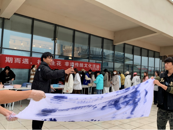 负责人向同学们详细介绍了扎染的历史、技法及特点,并示范了创作过程,在志愿者的指导下,根据自己的喜好进行创作。