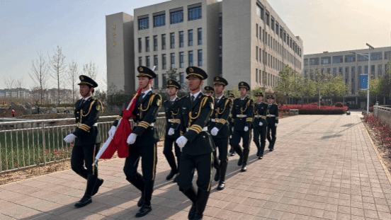 国旗护卫队迈着整齐的步伐,护送国旗入场,在雄壮的国歌声中,五星红旗冉冉升起。