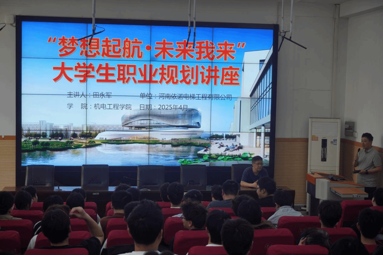 4月16日上午8时,机电工程学院电气自动化专业全体学生在学院报告厅参加了以"梦想起航  未来我来"为主题的大学生职业规划专题讲座。讲座由依诺电梯工程有限公司人力资源部田经理主讲,旨在通过专业指导帮助学生建立科学的职业发展理念,为未来职业生涯做好准备。