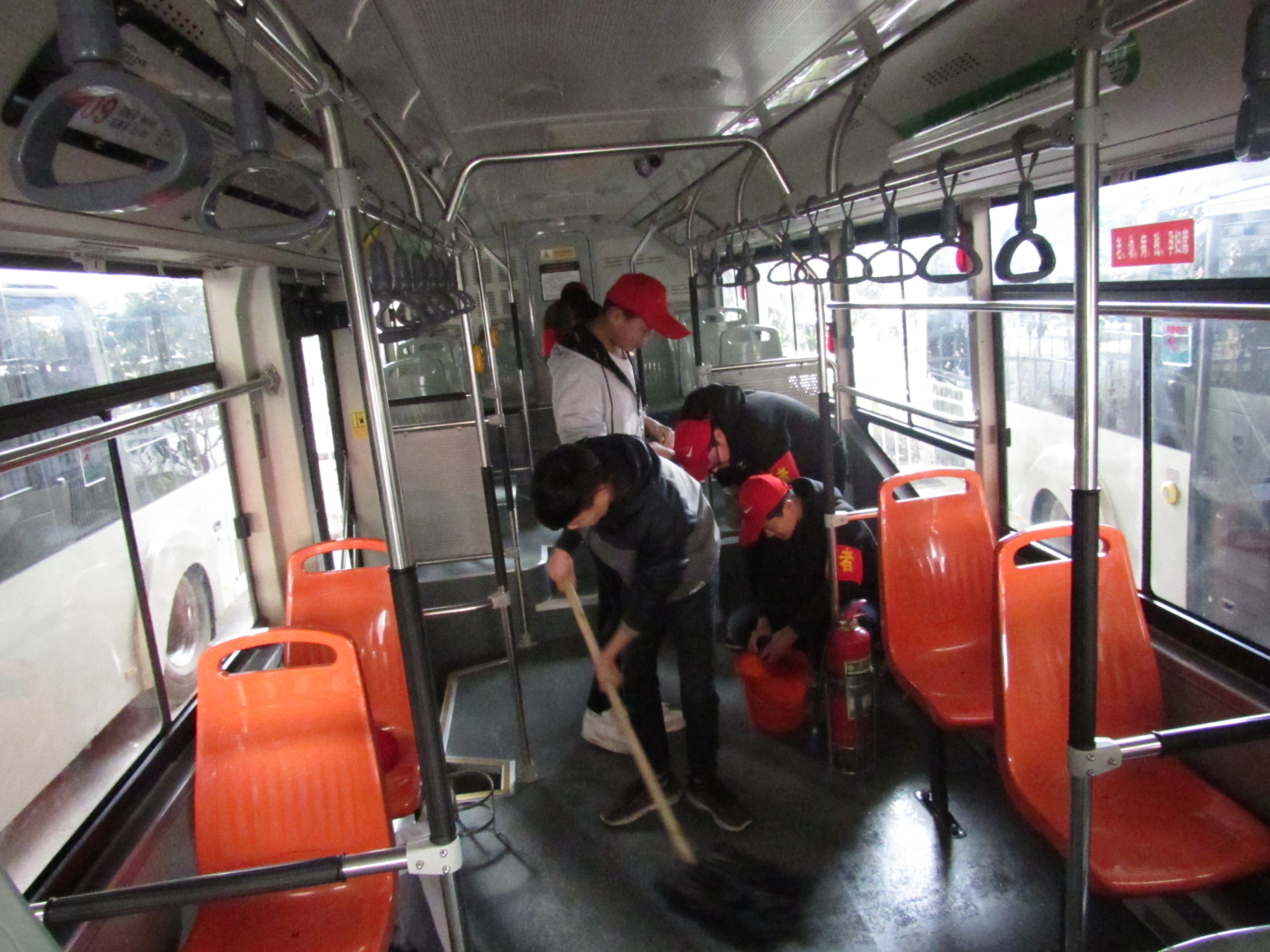 志愿者们打扫公交车