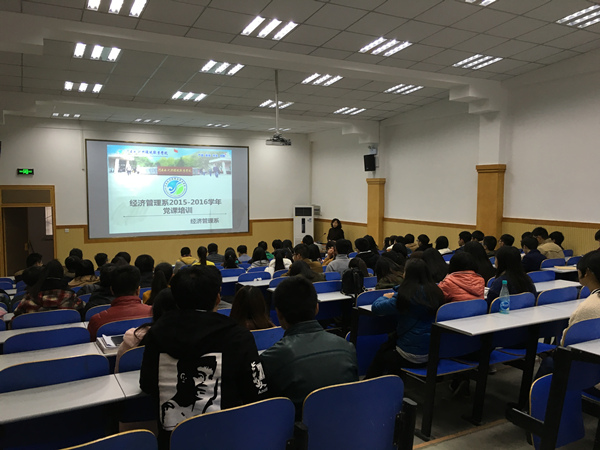 为做好推优工作,2015年11月10日下午4点半,经济管理系在北教二阶组织了本学期第二次党课培训本次培训主要针对15级新生中向党组织递交入党申请书的学培训系党支部书记陈锦杰就如何早日成为合格的共产党员强调指出,一是端正入党动机;二是按照党员标准严格要求自己;三是严格履行党章规定的入党手续。她要求同学们要在学习、生活、工作中锻炼自己,在服务社会、服务学生、奉献自我中得到成长,争取早日加入党组织。
