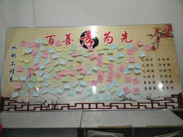 11月10日下午,水利工程系举办了以“百善孝为先”为主题的道德讲堂活动,系主任徐水平以及教师代表参加活动此次活动共分为唱歌曲、学模范、诵经典、发善心、做承诺、写祝福6个环节,让大家自我修行、自我教育、自我提升,洗心净心。徐主任在讲话中指出,希望大家都能积极参与认真感悟,通过“道德讲堂”的引导,认识到孝的重要地位 ,尽孝道不能仅限于一些特定的节日,需要在生活点点滴滴中体现,孝敬父母赡养老人是我们每个人应尽的责任和义务。活动中老师和同学们都认真参与每一个环节,用心聆听老师的演讲,真正感受心灵的成长,成为道德建设的先行者和道德传播的实践者。
