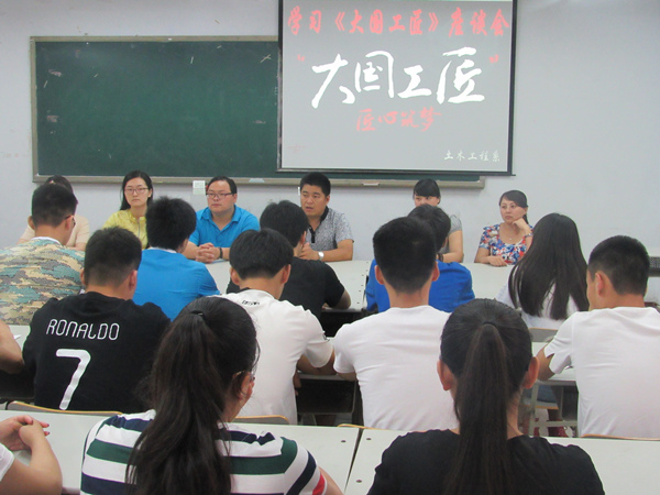 为提升同学们在“技术技能上寻发展、求突破,在职业精神上早打磨、勤抛光”的积极性和主动性,弘扬“劳动光荣,技能宝贵,创造伟大”的时代风尚,2015年6月17日,土木工程系在南教202举行了学习《大国工匠》座谈会。系副主任钟含、学管、辅导员及各班积极分子参加座谈会。