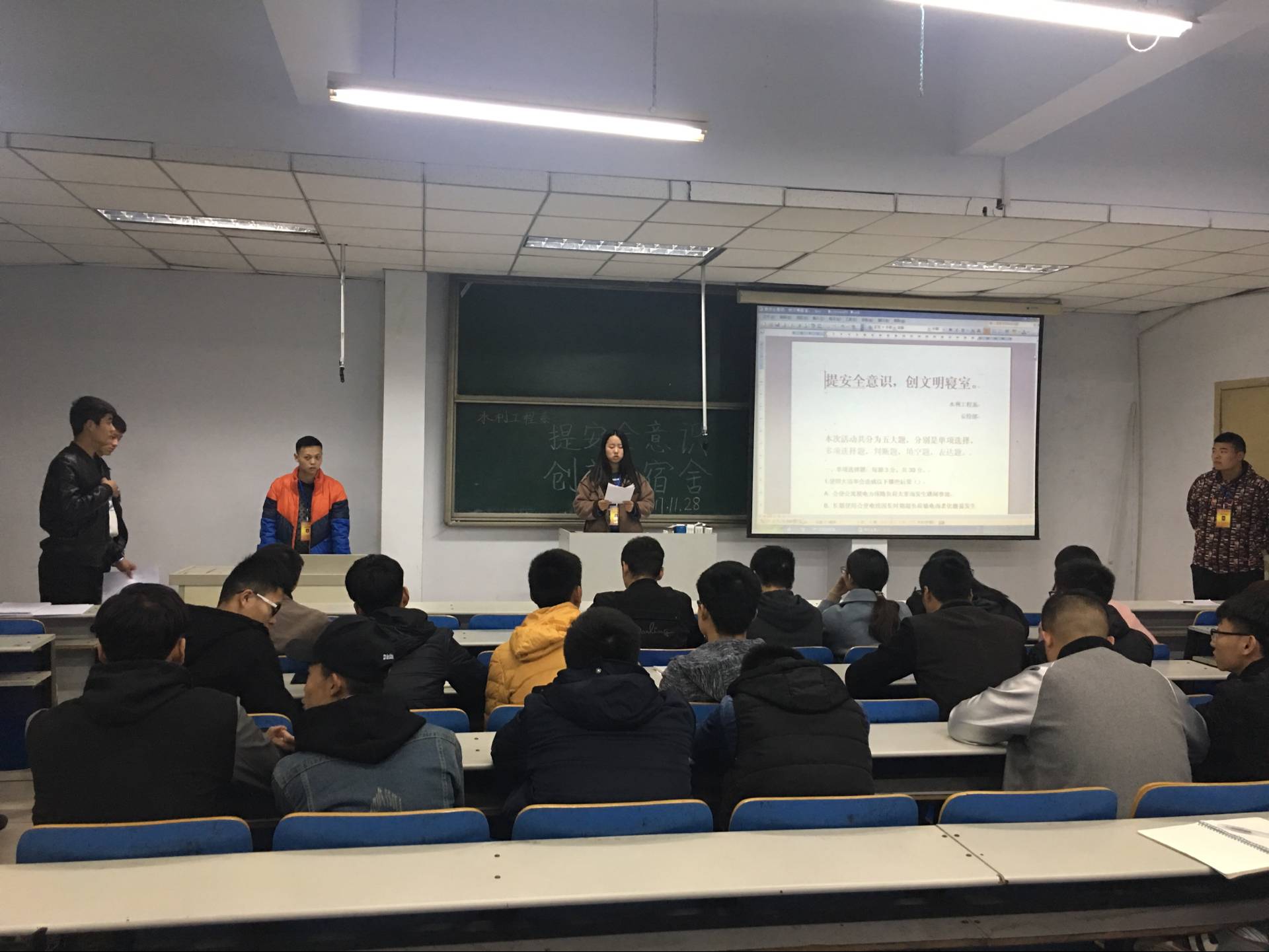 提高同学们的消防安全意识,11月30日1925,水利工程系在南教105教室举了“提高安全意识,创建文明宿舍”知识竞赛活动,水利工程系各班派代表参加。