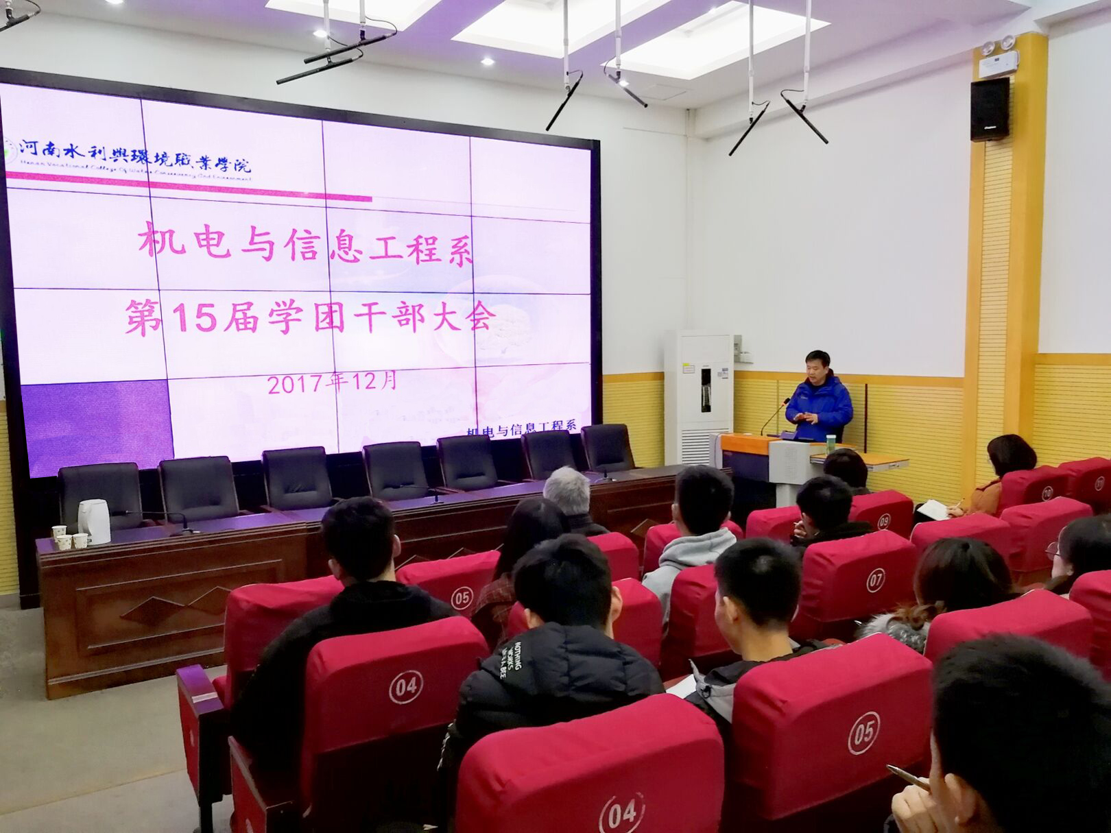 2017年12月27日19:00,机电与信息工程系在北教三阶召开第15届学团干部大会,系党支部书记武凤翔、副主任岳学超、学管教师和全体学团干部参加会议。