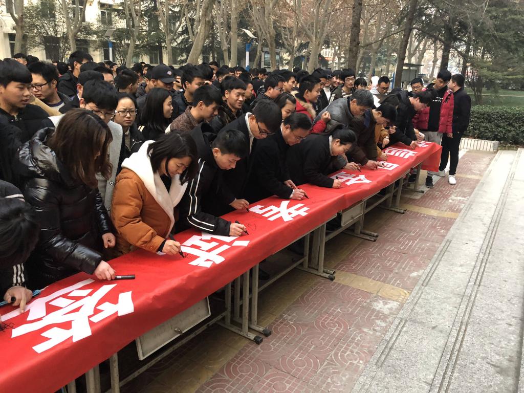 2017年12月27日1630,水利工程系举“诚信是金”考试签名活动,学生代表纷纷在条幅上签名承诺