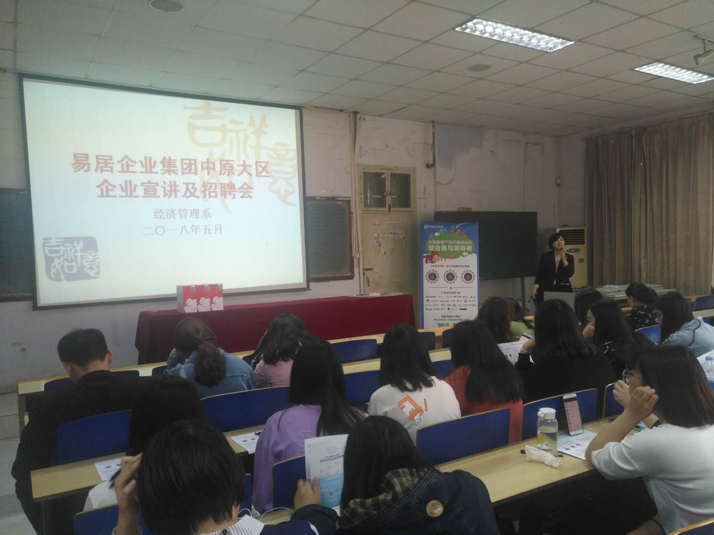 5月22日下午,经济管理系在讲堂1举办了2016级学生毕业实习学生专场招聘会。易居集团中原大区到现场进行企业宣讲和招聘,2016级房地产专业和会计专业全体学生参加招聘会。