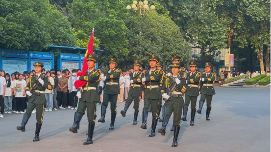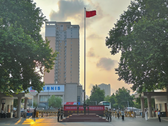 迎着初升的太阳,鲜艳的五星红旗冉冉升起,全体师生面向国旗庄严肃立,齐唱国歌,行注目礼。