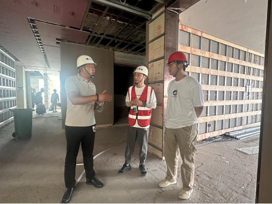 在项目部,项目经理介绍了项目的背景、目标、设计理念以及建设过程中的重要节点,着重强调了参观过程中的安全事项。进入施工现场后,项目监理人员和技术质量部工作人员结合施工现场的实际情况,为学生们详细讲解了办公用房与商业用房在功能和设计上的区别,讲解了PLC轻质隔墙施工优势、异形吊顶施工工序以及被动式建筑节能技术的相关理论知识。