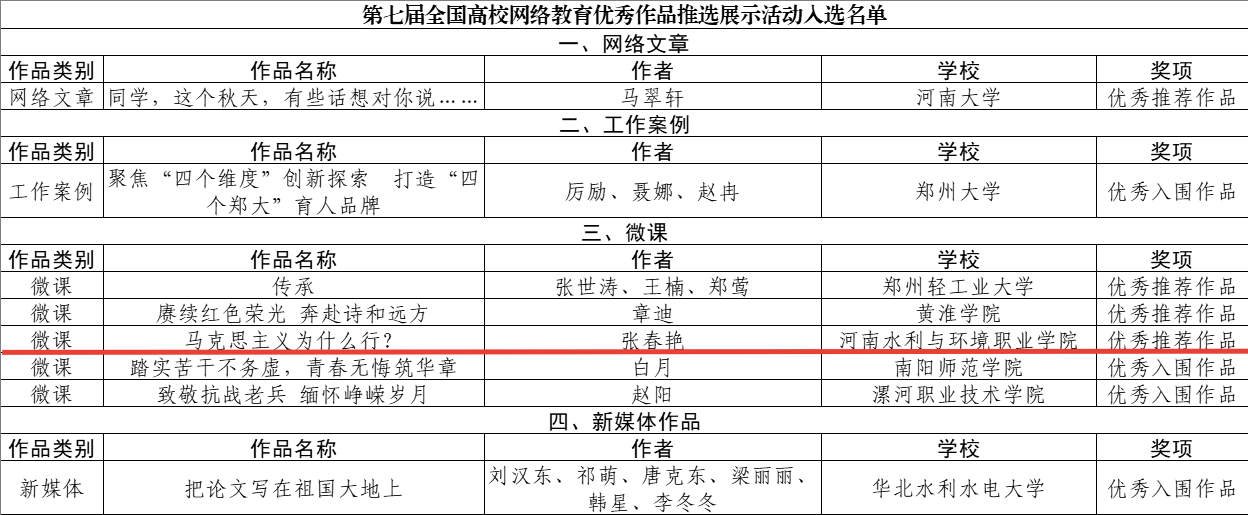 9月25日,教育部思想政治工作司、中央网信办网络社会工作局公布了第七届全国大学生网络文化节和全国高校网络教育优秀作品推选展示活动入选名单,ylzzcom永利总站线路检测思政课教师张春艳的微课作品《马克思主义为什么行?》入选优秀推荐作品,是全省高职院校唯一入选的微课优秀推荐作品。